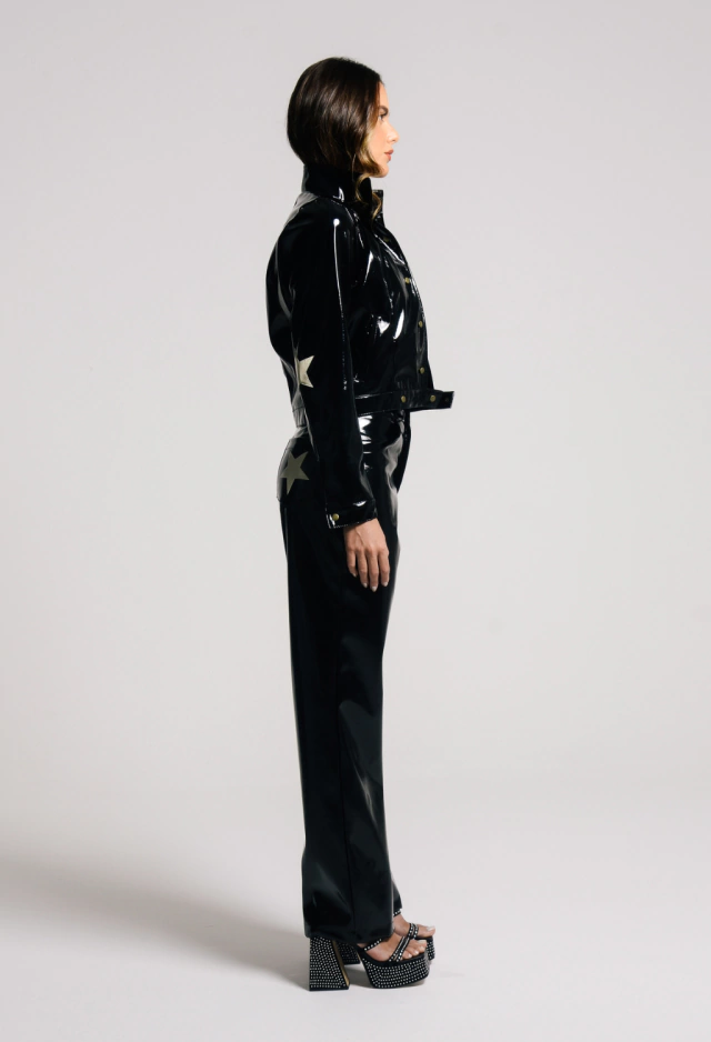 Tha statemant pants! Calça confeccionada em vinil com textura craquelada. Tem modelagem reta e cintura alta. Possui detalhe de estrela bordado no bolso direito.