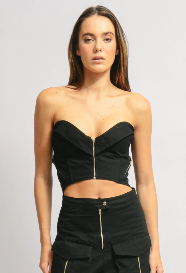 Corset confeccionado em sarja de algodão, possui leve assimetria na lateral, lastex nas costas e fecho em zíper frontal.