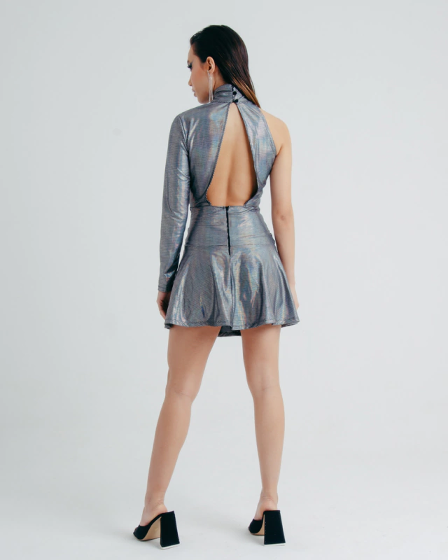 Vestido confeccionado com tecido holográfico, modelo usa tam P. Detalhe de abertura nas costas.