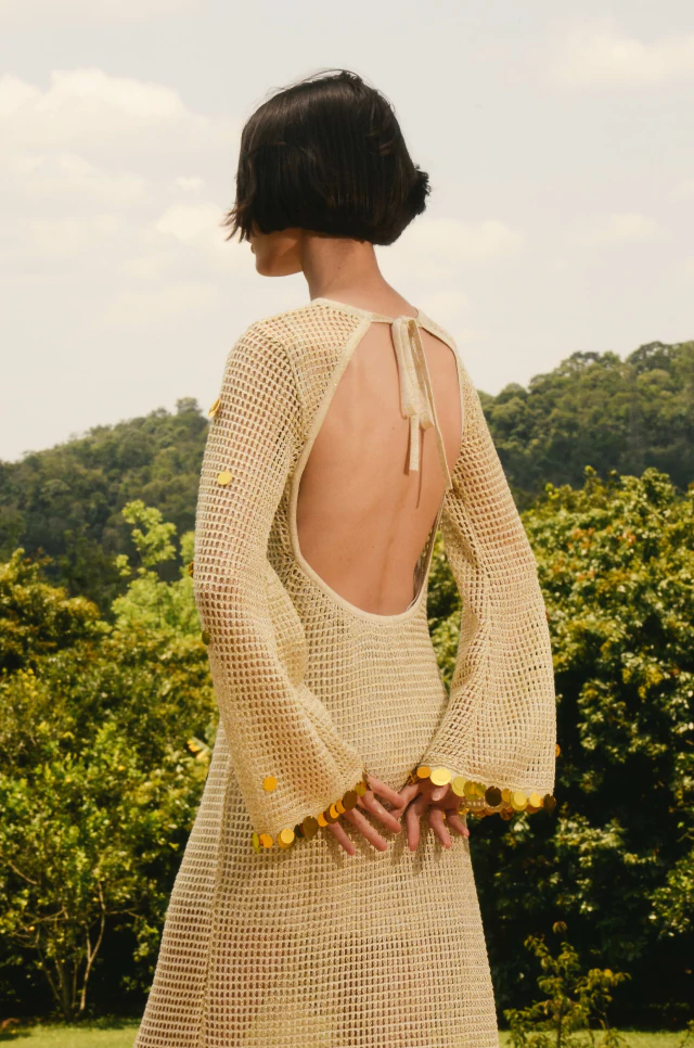 New version do Vestido Brezza. A nova versão do vestido de tricot tem comprimento mídi e costas nuas. Com o ponto mais aberto, é uma peça ideal para o verão. Possui lantejoulas bordadas por todo o comprimento e nas mangas. Acompanha um vestido curto de malha como forro.