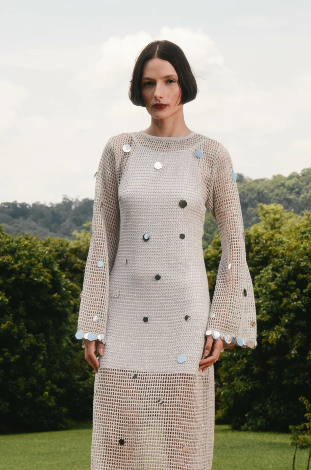 New version do Vestido Brezza. A nova versão do vestido de tricot tem comprimento mídi e costas nuas. Com o ponto mais aberto, é uma peça ideal para o verão. Possui lantejoulas bordadas por todo o comprimento e nas mangas. Acompanha um vestido curto de malha como forro.